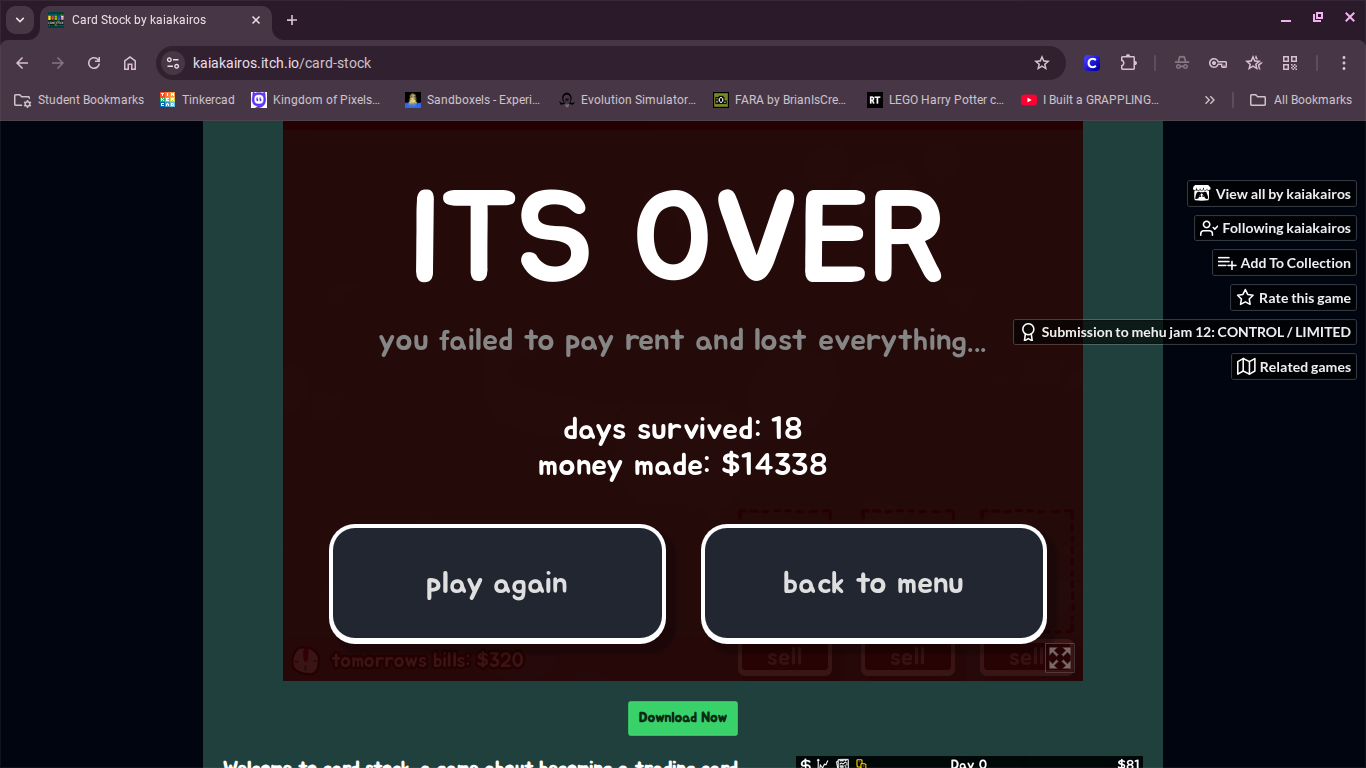 hi people, I made this game in about 6 days for funsies. Originally I made it last weekend for a 48 hour jam. The jam version kinda sucked ass, there was zero strategy it was just how fast can u buy cards and throw it in the sell box. So I've spent the last 4 days polishing it up into something a little more presentable. To be honest, while this version is better its still kind of mid. I've never made a game like this and balancing it was pretty challenging for me (having ur mechanics rely heavily on RNG sucks ass never do it). I think it's decent enough tho that a couple people at least will get a kick out of it.